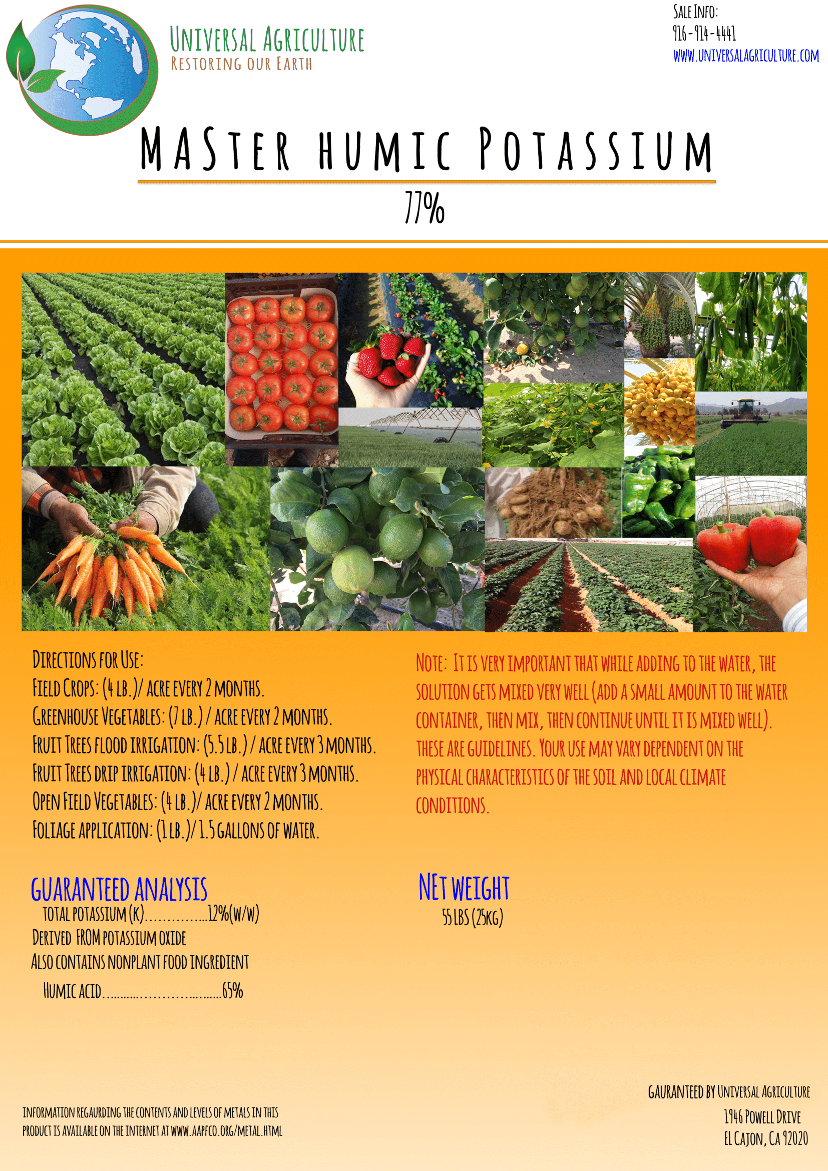Contains 77% humic potassium, ensuring maximum efficacy for soil and plant applications.